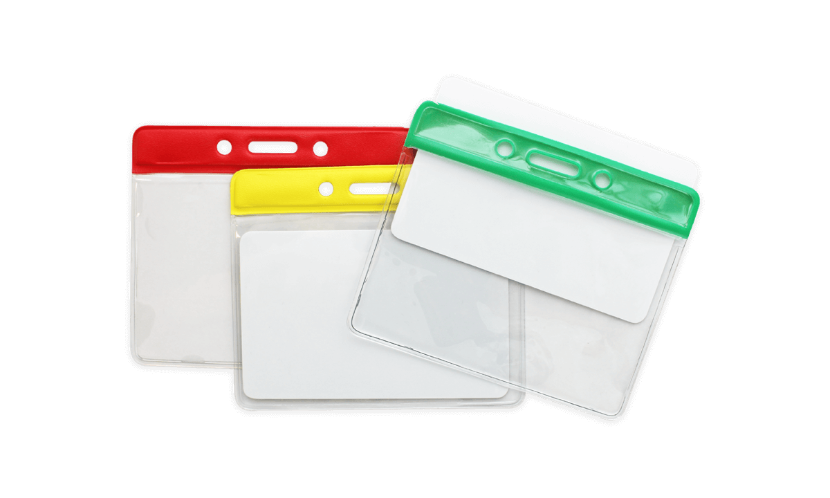 Personalisieren Sie Ihren farbcodierten Kartenhalter mit Ihren eigenen Grafiken oder Logos!Transparentes Vinyl-Etui mit Farbsteg oben und Lang-/Kettenlöchern.Ideale Größe für Ausweise und Namensschilder!