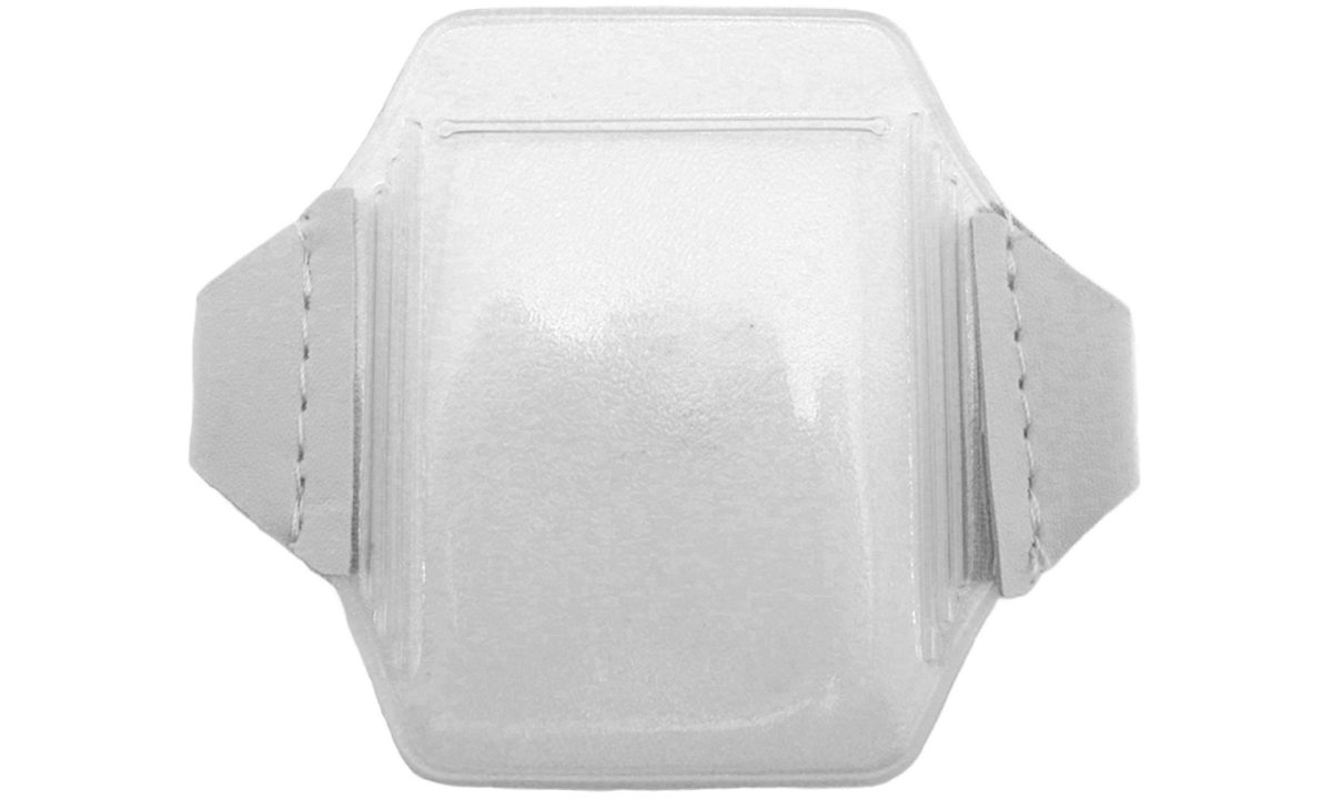 Belastbarer transparenter Vinyl-Armband-Namensschildhalter für Bauarbeiter. Bringen Sie ihn mithilfe eines einstellbaren elastischen Armbandriemens (separat erhältlich) an Ihrem Arm an.